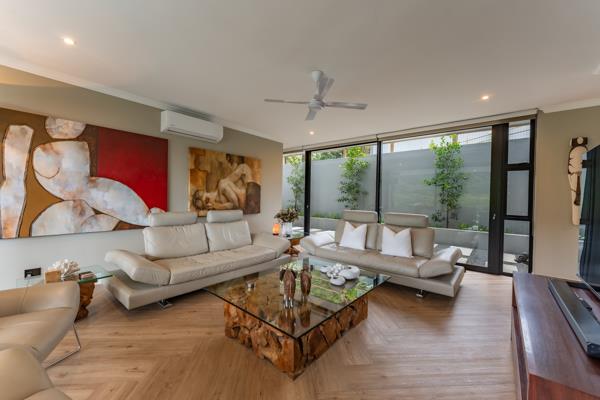 The upper level comprises four en-suite bedrooms, each with balcony access and air-conditioning. The main suite includes a walk-in wardrobe and a full bathroom with a double vanity, standalone bath, and double shower. Additional features include air-conditioning throughout, a triple automated garage with direct access, solar and battery back-up, water harvesting, and full staff accommodation. Residents have access to all Simbithi Eco Estate amenities. Contact the HUNT team to arrange a viewing.