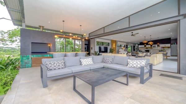 Stacking doors open onto a secluded outdoor entertainment oasis, complete with fire pit, braai area, and sparkling swimming pool - perfect for relaxed outdoor gatherings.