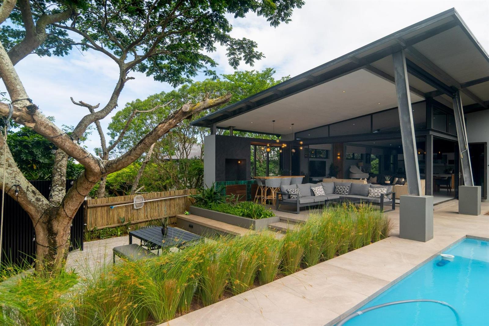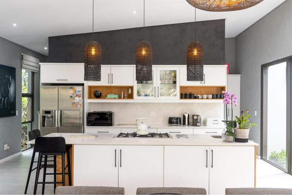 The home offers generous living and entertainment areas, including a cosy courtyard off the kitchen with hanging chairs. A second lounge features a large picture window looking directly onto the pool area, creating a striking focal point. Outdoor entertaining is complemented by a firepit zone and a covered patio with a uniquely tiled countertop and chimney, perfect for installing your preferred gas braai or cooking setup.