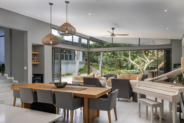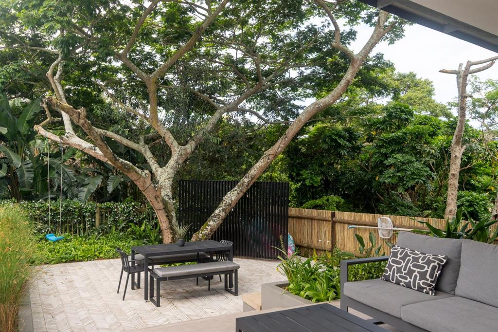 Modern family home perfectly positioned in the heart of Simbithi Eco Estate, just a short walk from the main community centre and sports field. Designed for comfortable family living, the bedroom wing includes three bedrooms, with a fourth bedroom located on a split level between the entrance and main living areas. Two bedrooms feature full ensuite bathrooms, while the remaining rooms each include a shower, toilet, and basin. All bedrooms open onto outdoor patio spaces through sliding doors.