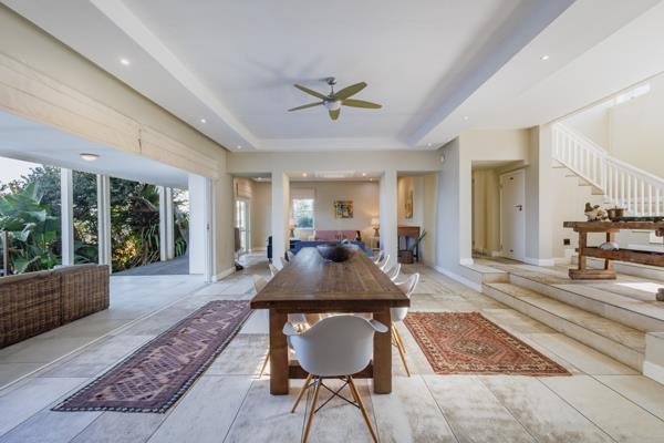 This spacious property in Tinley Manor offers expansive open-plan living areas that flow seamlessly onto a large deck with stunning sea views. No Transfer Duty. It features four generously sized bedrooms, each with a full ensuite bathroom, plus a separate guest suite on the lower level, ideal for hosting. The kitchen is fitted with a centre island, gas stove and ample storage space. This leads onto the outdoor entertainment area.