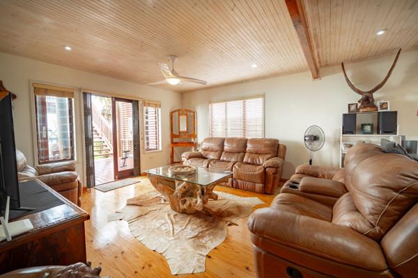 The open plan living area offers a double volume free flowing area onto the decks. The offerings on the home are extensive with a spacious separate flatlet with lounge, bedroom and bathroom, large automated double garage interleading door into a full workshop with double doors, laundromat, jo jo tanks, a self contained vegetable garden, electric fencing with alarms, full surveillance cameras, electric gate and 2 beams.