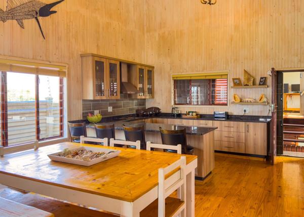 The modern lovely timber log home has 4 bedrooms, 3 and a half bathrooms, wrap around wooden deck with expansive views. The outside entertainment area is covered with braai area and a large pool with views, it also boasts a fire pit area for great outdoor socializing.