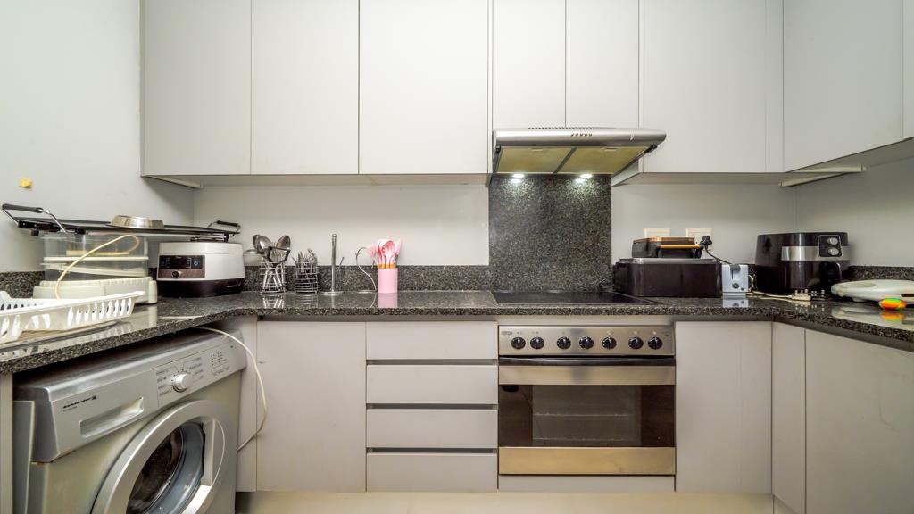Step inside to an inviting open-plan layout, seamlessly connecting the living, dining, and kitchen areas. The modern galley-style kitchen is a highlight, equipped with sleek grey cabinetry, dark granite countertops, and integrated appliances including an oven, hob, extractor fan, and space for a washing machine. Recessed lighting and durable tiled flooring extend throughout these communal spaces, creating a cohesive and contemporary feel.