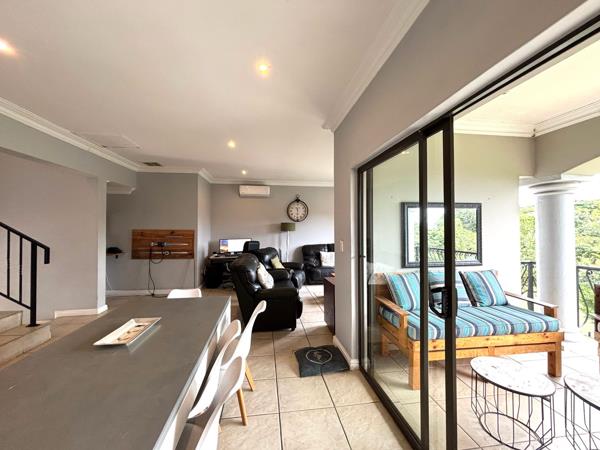 The top level boasts an additional room, ideal for a home office or a cozy second lounge, offering serene views of the lush greenery surrounding Fairway Villas and Umhlali Country Club.