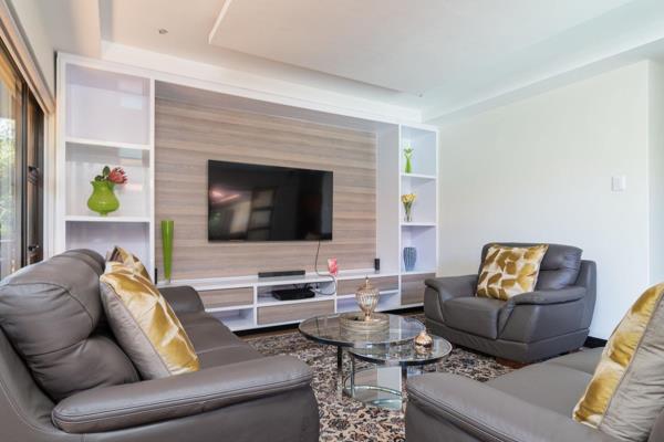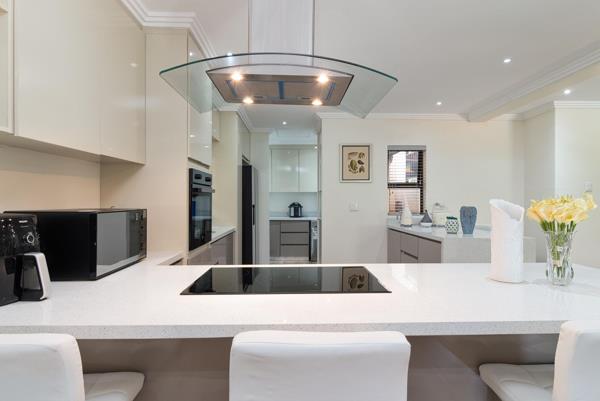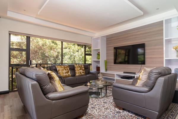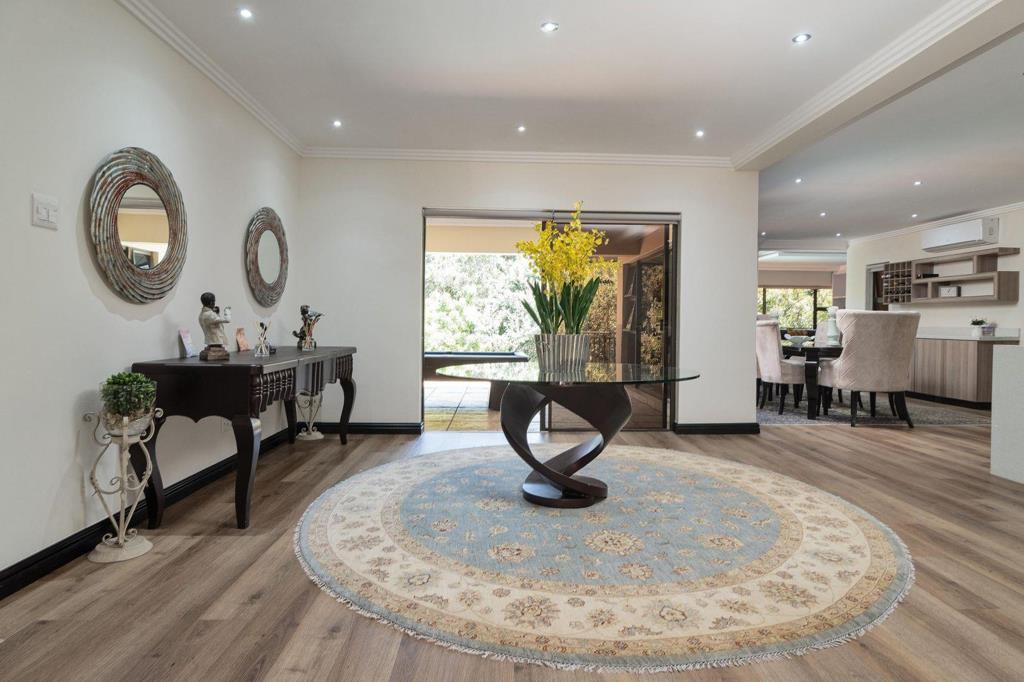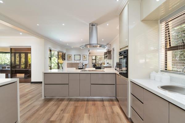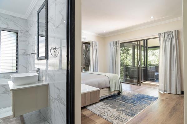 The generously sized entrance hall merges into the open plan living areas which all open to the outdoors. The beautifully designed ergonomic kitchen with a built-in bar counter, and a well fitted scullery positioned out of the sight line, adjoins the dining room which interacts with the outdoor covered verandah. This verandah area has a built-in braai and leads onto the paved pool deck. Adding to the allure of outdoor living an attractive gazebo on the pool deck is an ideal space for sundowners and alfresco eating. Built in cabinetry augments the sleek aesthetic of the dining room and lounge areas complemented by modern laminated flooring throughout. The tranquil lounge area also benefits from outdoor vistas and accesses the outdoor pool area.