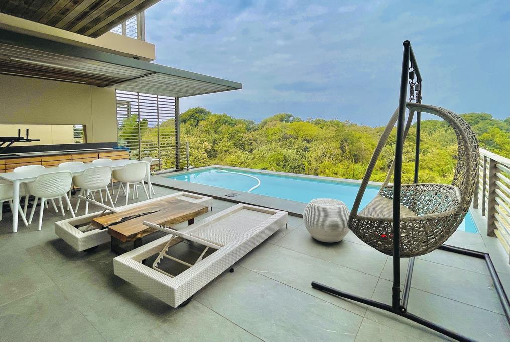 In the exclusive Oceans Edge sectional scheme, Zimbali, lie 31 easy-living, modern, duplex townhouses. This unit boasts sea views from the upper-level bedroom accommodation, which is accessed directly from driveway level easy access from the double garage. Clean and contemporary, whilst simultaneously enjoying the sound of the nearby ocean. The lower level comprises the entertainment and living area, beautifully open plan, with upmarket finishes, flow and an abundance of natural light.