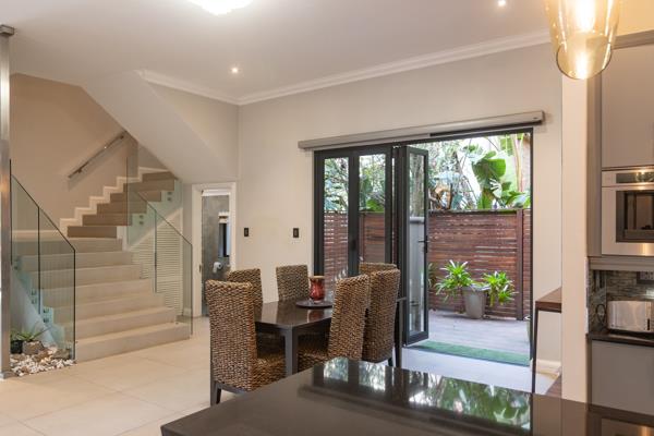 A charming little courtyard extends from the dining room, adding a touch of serenity to this already peaceful space. The modern kitchen is a true highlight, that furnishes, a gas stove, an eye-level oven, and a built-in coffee maker for the ultimate convenience. A separate scullery, just around the corner, ensures that this space remains tidy and clutter-free. The kitchens central location allows you to interact with family and guests, enhancing the sense of connection throughout the living spaces. A guest toilet is located on this level. The upper level of the home is dedicated to rest and relaxation, with generously sized bedrooms, each with its own ensuite bathroom for privacy and comfort. For added convenience, ample and secure parking is provided with a double garage, a golf cart garage, and at least three additional parking spaces.