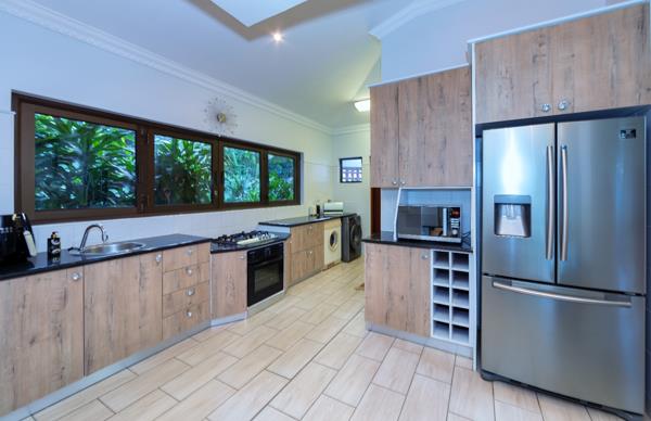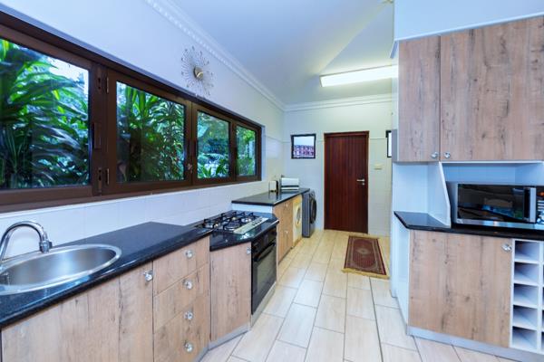 The kitchen is fully fitted and large with a scullery and laundry area. An large breakfast counter is a clever addition fora family.