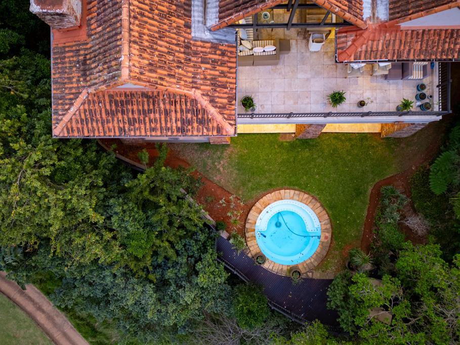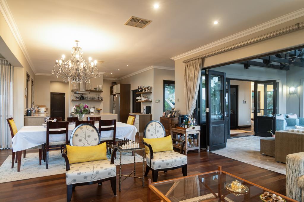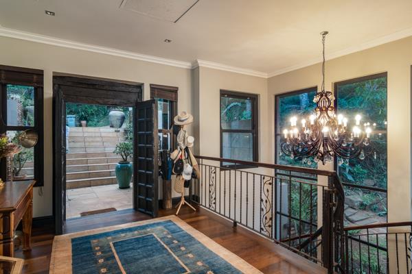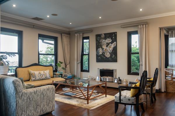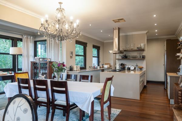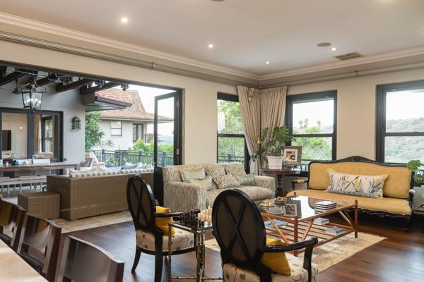 The upper level is an entertainers delight, featuring a covered patio with A-frame detail, elevated views, and effortless flow between the formal lounge, dining area, and bar. Rich Panga Panga wood flooring runs throughout, complemented by hand-selected travertine tabletops and statement chandeliers by Morgan and Associates. At the heart of the home, the open-plan kitchen and scullery are positioned for easy hosting, flowing into a relaxed living zone with a fireplace lounge and stacking doors that open onto the covered patio. A dedicated study offers direct access to the upper balcony, making it ideal for a work-from-home setup with a view. The spiral staircase leads to a second lounge below, connecting all four en-suite bedrooms, each thoughtfully positioned for privacy and garden access. Outside, a level lawn wraps around a sparkling plunge pool and raised deck overlooking the golf course''s 4th green and tranquil dam. Practicality meets style with direct garage access, golf cart parking, a tucked-away wine cellar beneath the garage, and a built-in braai beside the courtyard, offering multiple zones for leisure and retreat. This home delivers a sophisticated lifestyle immersed in nature, within one of Zimbalis most desirable locations.