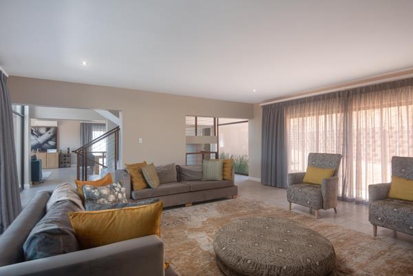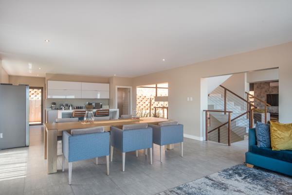This home radiates modern contemporary living, with its stylish architectural design elements. This sunny and spacious multi-level home is conveniently positioned within close proximity to a main estate entrance point and offers the best of both worlds, with both sea and inland views. The home has modern finishes throughout and the living spaces are generous in size, further complimented by a large, covered patio for outdoor relaxation and entertaining. The kitchen is fully fitted and is served by a separate scullery.