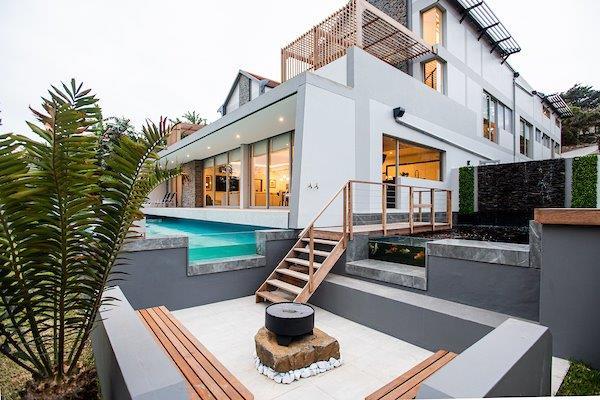 On the first level leading out of the glass doors is a sunny balcony in a Bonsai Oasis, overlooking a private rim flow pool with an established level garden and Boma area.