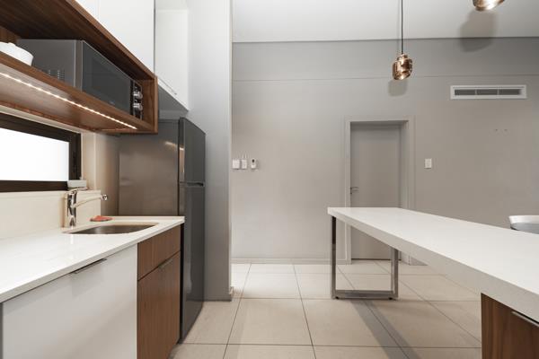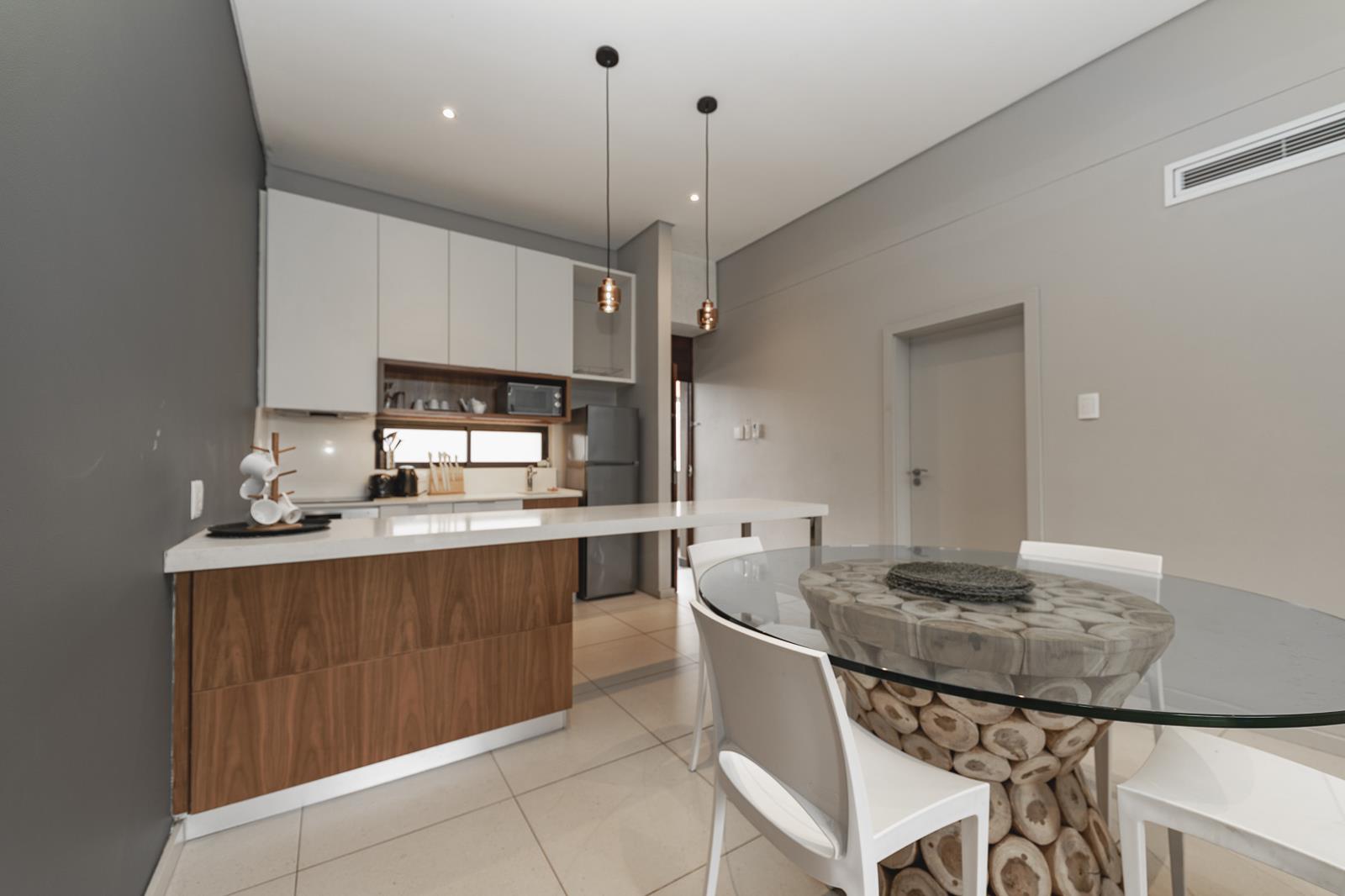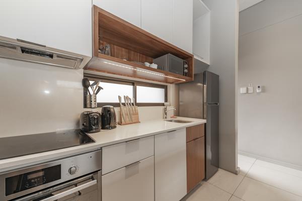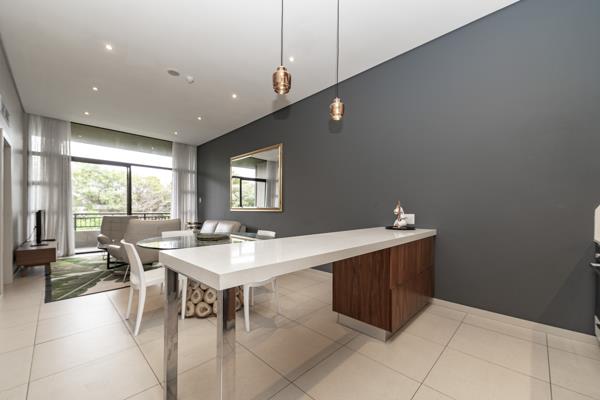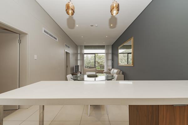 A modern, contemporary styled kitchen with a breakfast nook that leads to the dining area. An open plan lounge with sliding doors to the private balcony that overlooks the forest and estate.