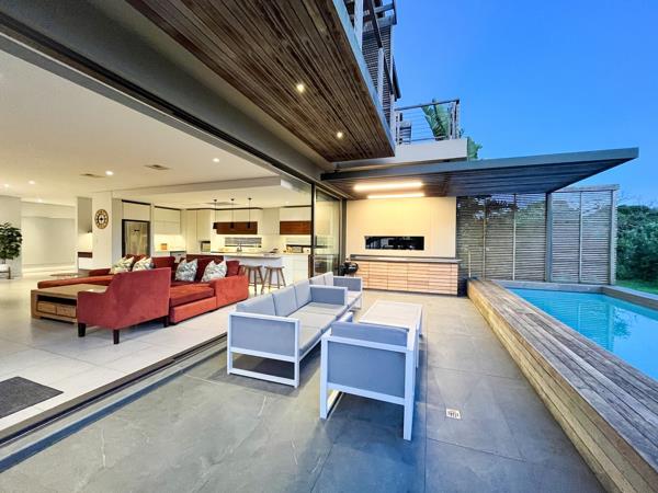 Step inside and experience architectural elegance, where wall-to-wall sliding doors invite natural light and open onto a covered patio with a rim-flow pool, built-in gas braai, and private courtyard perfect for entertaining or relaxing in style.