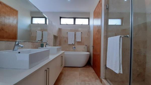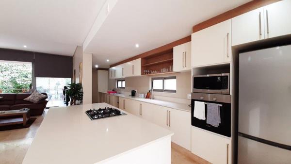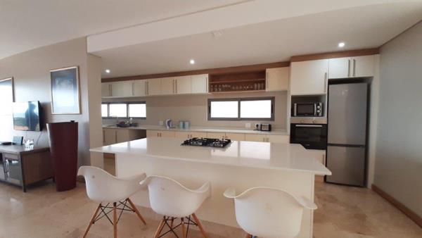 The open plan layout is elegant and sophisticated in its decor, with large expanses of glass to maximize those breathtaking sunrises, forest, and sea views. The elegant designer kitchen is spacious and fitted with Caesarstone countertops, ample cabinetry, a Bosch gas hob and electric oven, a kitchen island with a breakfast nook, and a separate scullery.