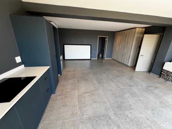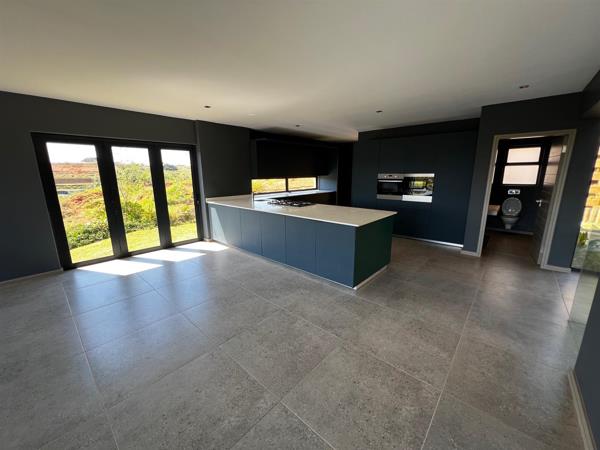 The middle level is the heart of the home, showcasing an open-plan kitchen and living area that extends onto a scenic patio. From here, views over the lush golf course as well as towards the sea can be enjoyed. An additional lounge area on this level opens onto a landscaped garden and a beautifully paved pool area, creating an ideal setting for relaxation and entertaining.