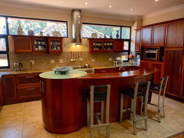 The open plan dining and spacious living areas with luxurious chandeliers and cozy fireplace, leading to the kitchen with a Gas stove, pantry, scullery, and guest toilet.