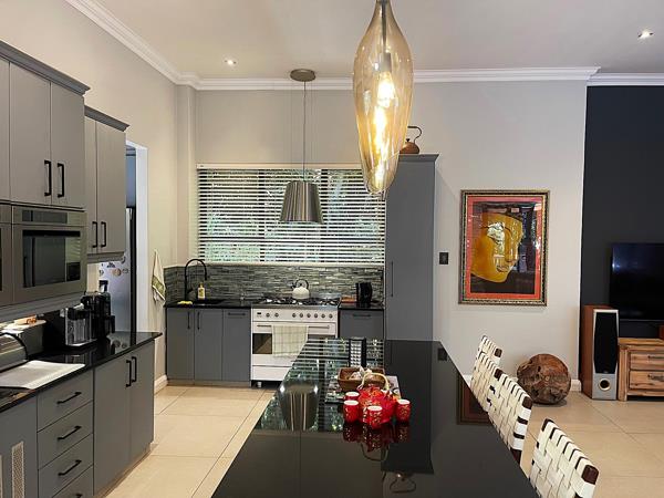 The sleek, modern kitchen is a culinary delight, designed to be part of the living experience. It is equipped with top-of-the-line appliances, including a stunning freestanding gas stove, and is finished with durable granite countertops. A separate scullery and laundry area ensure practicality without compromising the aesthetics of the main living spaces.