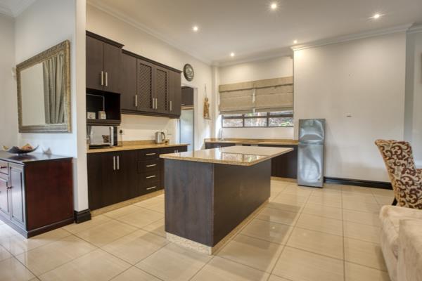 The home welcomes you with an impressive double-volume entrance, where a grand staircase guides you to the open-plan heart of the residence. This space effortlessly combines a dining area, kitchen, and living room, perfectly suited for entertaining. The dining area flows onto a private deck, while the living space connects to two distinct outdoor retreats: one featuring an entertainment area with a built-in braai and splash pool, and the other a tranquil deck. Completing this level are a guest toilet and a spacious en suite bedroom.
