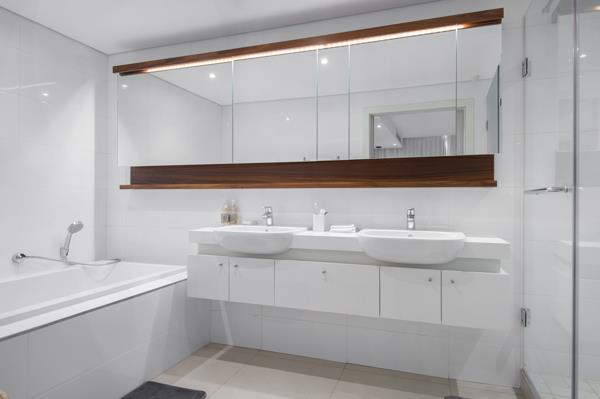 The designer kitchen is fitted with high-end appliances, Caesarstone countertops, and under-counter LED lighting. A separate scullery (with dishwasher), laundry area (washer and dryer), and walk-in pantry offer both style and practicality.