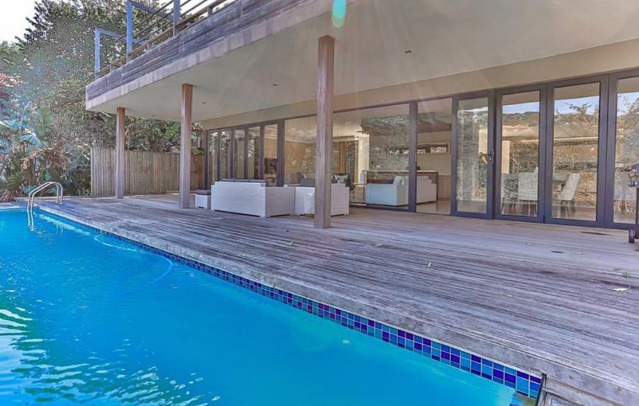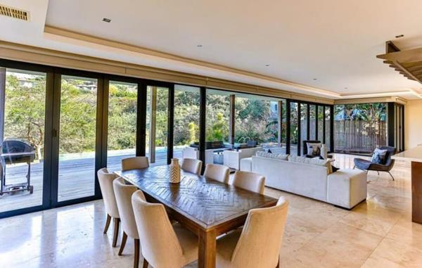 The open plan living areas create a seamless flow throughout the home, accentuated by a modern built-in bar, ideal for hosting gatherings. Expansive folding glass panels invite the outdoors in, leading you to a covered patio that overlooks an extra-length pool, surrounded by lush greenery and a serene green belt.
