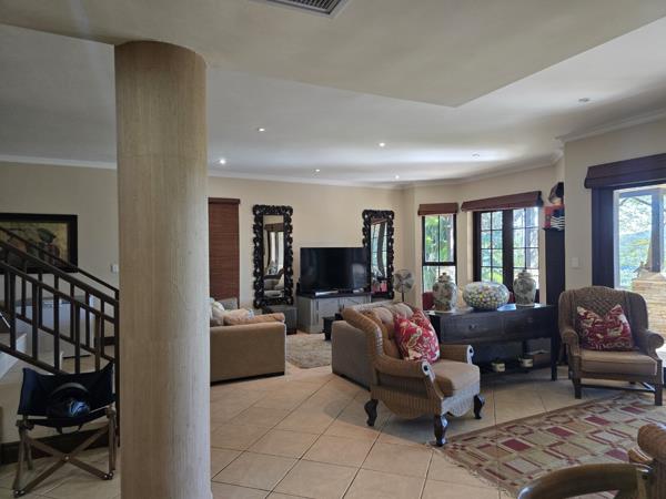 Discover this captivating two-story Mediterranean-style residence nestled within the prestigious Zimbali Coastal Resort and Estate in Ballito. The property immediately impresses with its large covered veranda, framed by elegant stone-clad pillars, and is embraced by lush tropical landscaping, ensuring privacy and a serene natural setting. Its well-maintained exterior and architectural details create an inviting first impression.