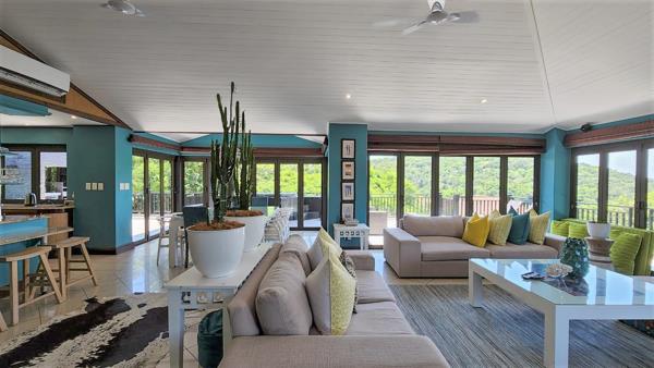 The modern decor and quality of finishes throughout makes this a home of distinction. This 5 bedrooms, 5-bathroom unit is a tranquil getaway from the rigors of everyday life. Coming into the home you are welcomed into a large entrance hall. To the right you have dark and cozy bar area and lounging space. There are 4 bedrooms that lead from this lounge. All the bedrooms have their own bathrooms. There is also a small plunge pool. Going up the stairs you have the spacious open plan Living Space. The space is beautiful and leads out onto a large deck with great Sea Views, there is a build in Jacuzzi situated under the covered patio. The Kitchen has ample storage space, with a separate scullery.