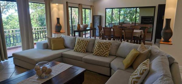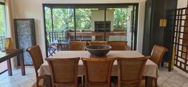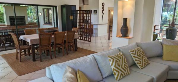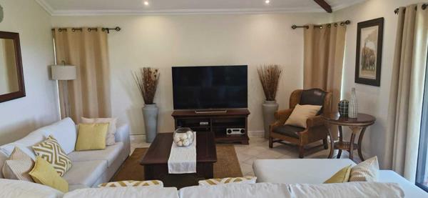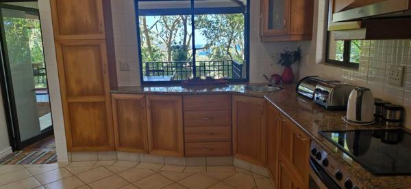 The living areas enjoy an easy, open flow from the modern kitchen through to the lounge and onto a lovely covered patio with built-in braaiperfect for relaxed entertaining. From here, enjoy views across mature trees and glimpses of the ocean beyond.