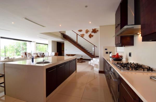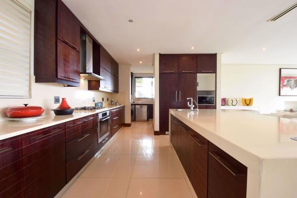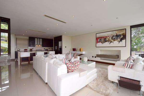 The homes modern, sleek interiors are characterised by large open plan and partially double volumes spaces offering Reception and dining areas together with a socially interactive gourmet kitchen (Caesar stone and integrated appliances) all of which, together with the homes study or 2nd lounge, merge onto the pool and patio area through vast fold away glass panels.