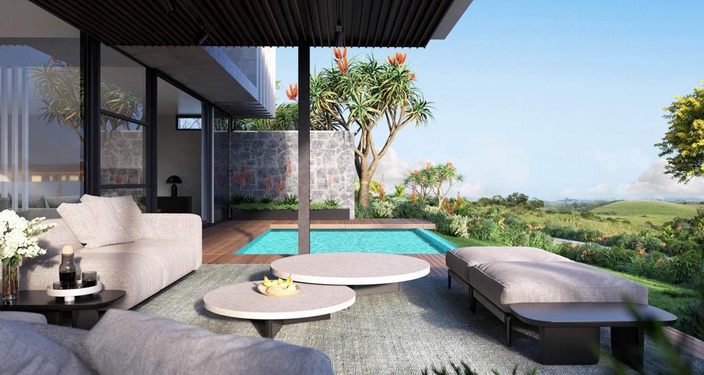 Modern four-bedroom home in Zimbali Lakes. This home offers high-end finishes, expansive living and entertainment spaces. On entrance is a living space, dining area and well sized kitchen with a centre island and scullery. The living space leads out to a covered patio, pool and garden with sea views.