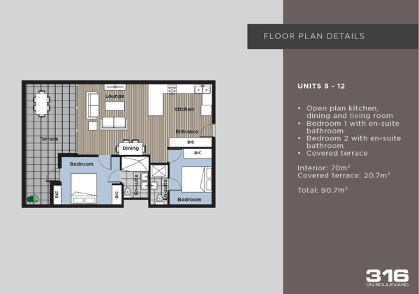 All units offer open plan kitchen/-dining/lounge areas, 2 en-suite bedrooms and covered terraces. Access controlled with 2 undercover parking bays per unit. High-end finishes. Pre-installed solar panels, inverters and batteries offering eco-friendly back-up power. Energy conscious inverter aircon units and low-voltage LED fittings. - Communal facilities including, garden, pool, pool room and laundrette. Basement storage units available for purchase
