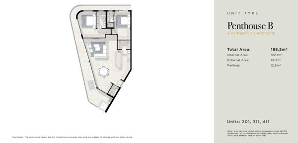 Penthouse design type B is positioned on Floor 2, 3 and 4. The 2-Bedroom, 2,5-Bathroom, Penthouse Type B options, 188,5m2, range in price from R10 320 000 (Floor 2), R10 820 000 (Floor 3), and R11 320 000 (201m2 Floor 4) inclusive of VAT.