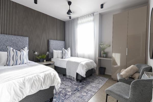 This well-appointed air conditioned apartment, with built-in cupboards and quality finishes, has a central living area harmoniously integrated into the well equipped kitchen, featuring a Bosch hob with extractor fan, under-counter Bosch oven, ample cupboard storage space, an additional space for a fridge, washing machine (or dishwasher) and microwave.