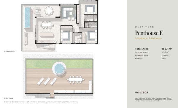 Penthouse design type E is positioned on Floor 5 with the entertainment area and pool positioned on Floor 6. The 3-Bedroom, 3-Bathroom, Penthouse Type E is inclusive of VAT.