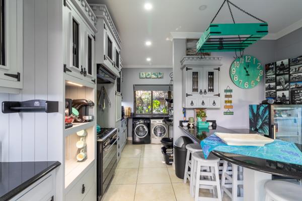 The kitchen features a standalone gas cooker and a spacious scullery. A coffee counter and breakfast nook are also very useful.