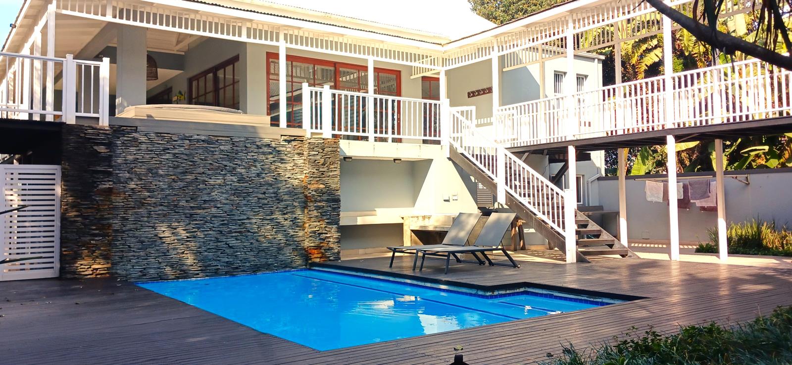 The main entrance level has a wrap-around patio from the bedrooms to the outside sun lounge and braai area that overlooks the swimming pool and fire pit in the protected courtyard.