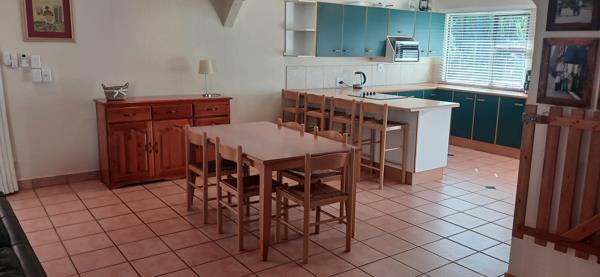 A covered outdoor entertainment area overlooks the sparkling swimming pool, providing the perfect setting for year-round braais and relaxing by the water.