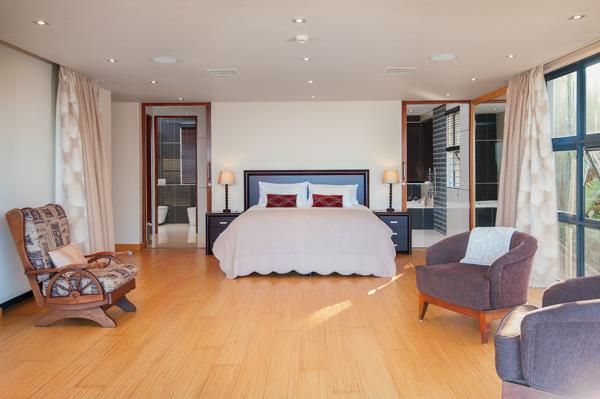 The living areas are open-plan and feature a granite-topped kitchen which leads to the dining area and then to the mid-level lounge. There are glass stacking doors that fold away, opening onto a large covered balcony. The main bedroom is located on this level and has his and hers basins, toilets, and showerheads. The large shower has massage jets and there is also a luxurious spa bath.