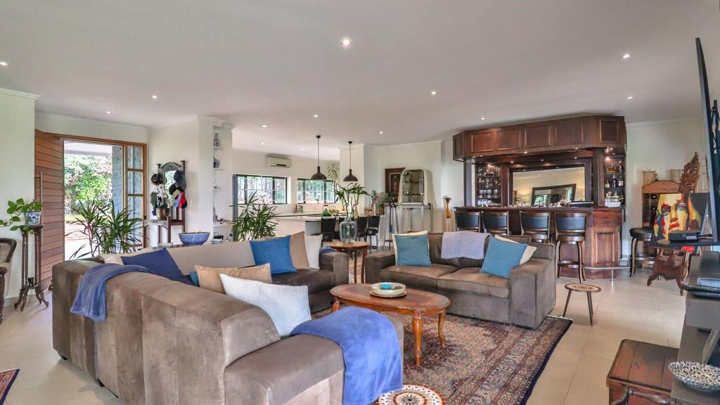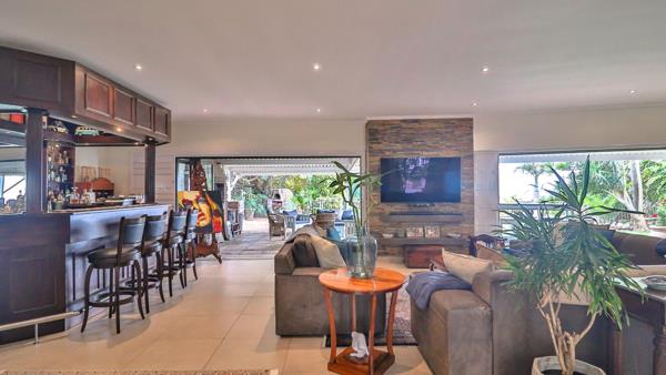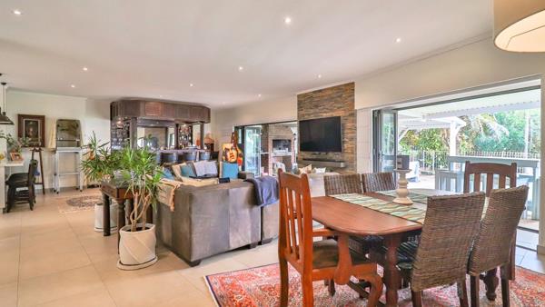 The heart of the house is an incredible open-plan living area, designed for seamless flow and entertaining. This expansive space comprises a comfortable lounge, an elegant dining area, and a sophisticated built-in bar. Stacking doors lead out to the covered patio that spans the length of the home.