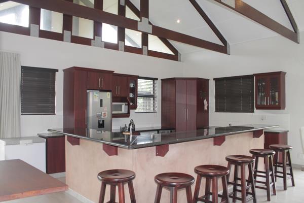 From the living area, stacking doors lead to a large wrap-around balcony, where you can take in the serene estate viewsperfect for entertaining or quiet moments of reflection. The main bedroom is also located upstairs, featuring built-in cupboards, air conditioning, and doors that open out onto the balcony. The en-suite bathroom is a standout, with a freestanding bathtub in the main room and a private area for the shower, basin, and toilet.