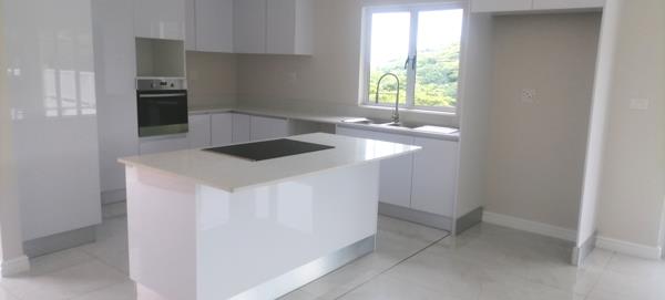Modern Open-Plan Kitchen: Boasting sleek white gloss cabinetry, quartz countertops, and ample storage including linen cupboards a chefs dream come true.
