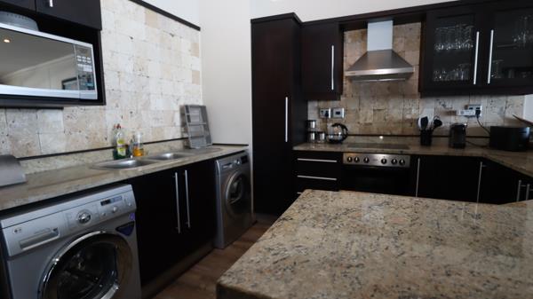 Step into a stylish modern kitchen with granite countertops, ample cupboard space, and high-end appliances This seamless flow into a spacious open plan living and dining area with panoramic ocean views is very tastefully furnished. Three generously sized bedrooms, each with built-in wardrobes, two bedrooms with ensuite bathrooms ideal for privacy and convenience, and a 3rd full bathroom for guests. There is ample space in a separate storage room that adds to the endless beauty and convenience of this apartment.
