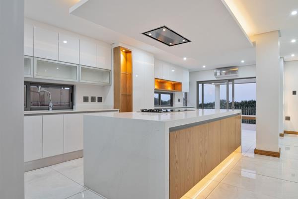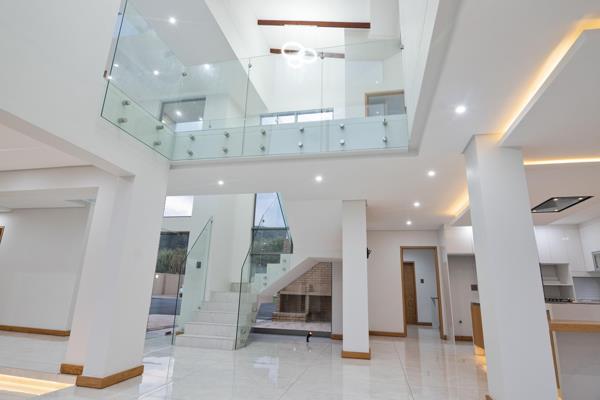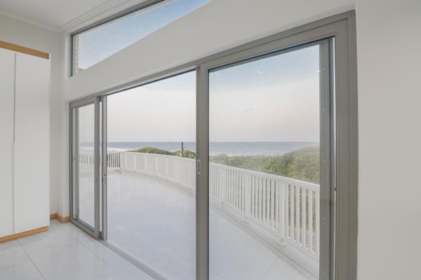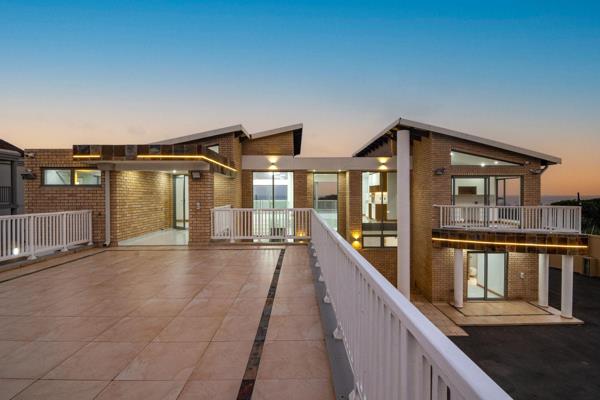 A centrally positioned skylight fills both the upper and lower floor levels with abundant natural light. A striking glass balustrade leads up to the upper level which holds a centrally located pyjama lounge and three en suite bedrooms with bathrooms that have been finished with the latest high-end sanitary ware. The spacious pyjama lounge has a built-in coffee station with running water and opens onto an outdoor patio. The master suite and a second bedroom are both sea facing and open onto an elevated balcony that offers exceptional ocean breaker vistas. The main bedroom offers a luxurious en suite full bathroom and a dedicated walk-in dressing area with generous cupboard space. The second and third bedrooms offer a modern built-in work desk area and ample built-in cupboard space, and the third bedroom opens onto an extensive outdoor patio which offers beautiful inland vistas and where lazy family days can be enjoyed. There is also a dedicated study on the upper level leading off the pajama lounge.