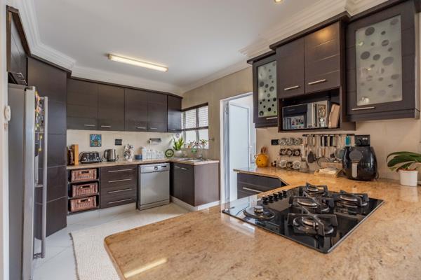 The landscaped garden is thoughtfully curated, featuring neat, low-maintenance greenery and trimmed plants that frame the home beautifully. A private courtyard and entertainment-ready braai area lead off the living space, enhancing the indoor-outdoor flow. A double garage offers direct access into the home, with secure parking for additional vehicles. The open-plan dining area flows seamlessly into the lounge, which opens onto a peaceful garden through sliding doors. An enclosed patio off the lounge adds further relaxation space, ideal for enjoying Durbans coastal climate.