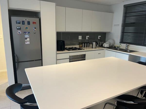 The interior boasts an open-plan layout, seamlessly connecting the living, dining, and kitchen areas. The modern kitchen is a focal point, equipped with clean white cabinetry, a spacious island with integrated seating, and built-in appliances including a hob and oven, all complemented by a stylish grey splashback. Large windows and sliding doors ensure ample natural light, while air conditioning provides comfort throughout. An entrance hall adds to the welcoming ambiance.