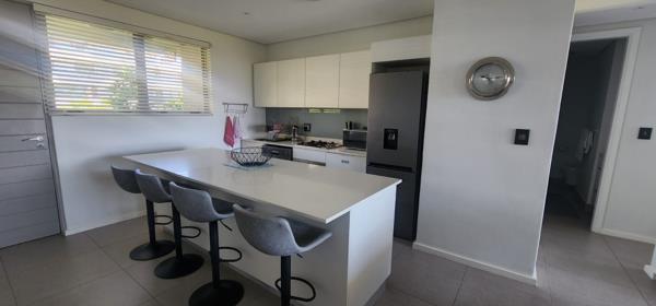 The open plan lounge and kitchen area has a lovely patio with a dining area, however the Caesarstone centre island doubles up as a kitchen workspace and dining area with lovely kitchen chairs.