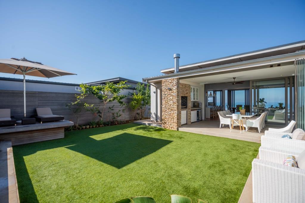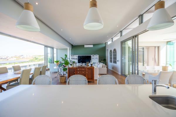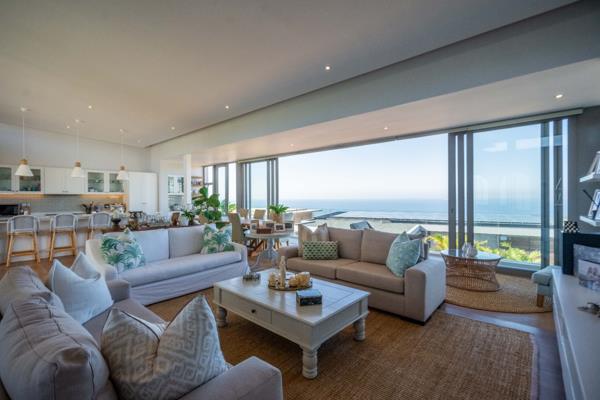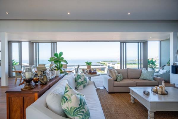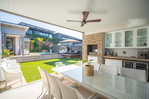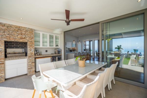 Designed to optimize on the sea views, the home has expansive glass sliding doors opening seamlessly back so the expansive reception rooms all appreciate the tranquil outlook of the ocean on the one side and leading seamlessly to the feature covered patio with built in server and braai overlooking the stunning garden and designer, heated, pool on the other side offering 4 beautifully appointed bedrooms, all ensuite with very modern bathrooms and a study area for work to work from home or homework station for the kids.