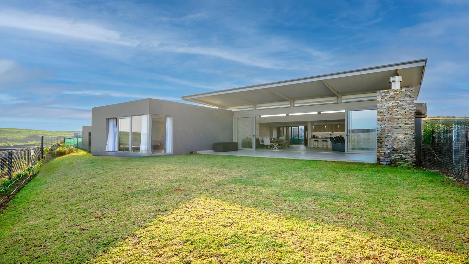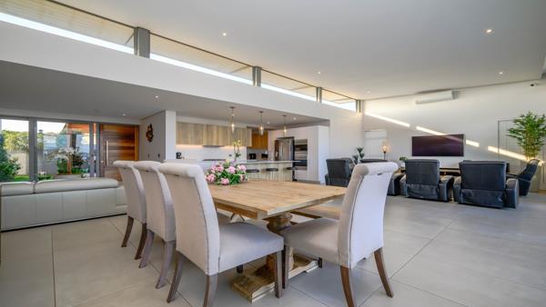 The open-plan kitchen, dining room and two lounges, flow onto a covered patio and garden, maximizing on beautiful sea views.
