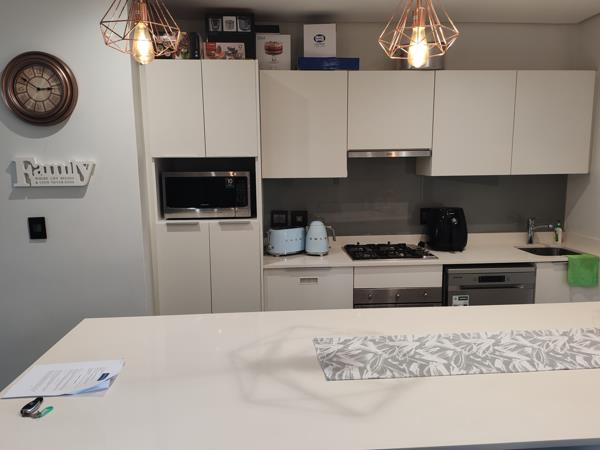 This modern apartment measuring 92 sq metres has two bedrooms and two bathrooms (1 ensuite) with a large balcony overlooking a picturesque garden area. There is a communal entertainment and braai area. The kitchen is well appointed with a gas stove, Also has a dishwasher and washing machine connections. There is a dining area with a fitted solid granite / Caesar stone table top. For your additional comfort the apartment has 3 air conditioners. The apartment comes with 2 secure under cover parking bays. Phone for an appointment to view.