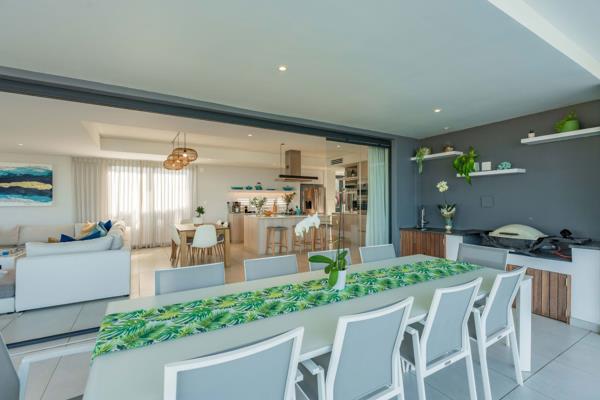 Spacious dining and TV room flowing seamlessly onto a large, enclosed patio with frameless glass doors and a built-in gas braai perfect for year-round entertaining